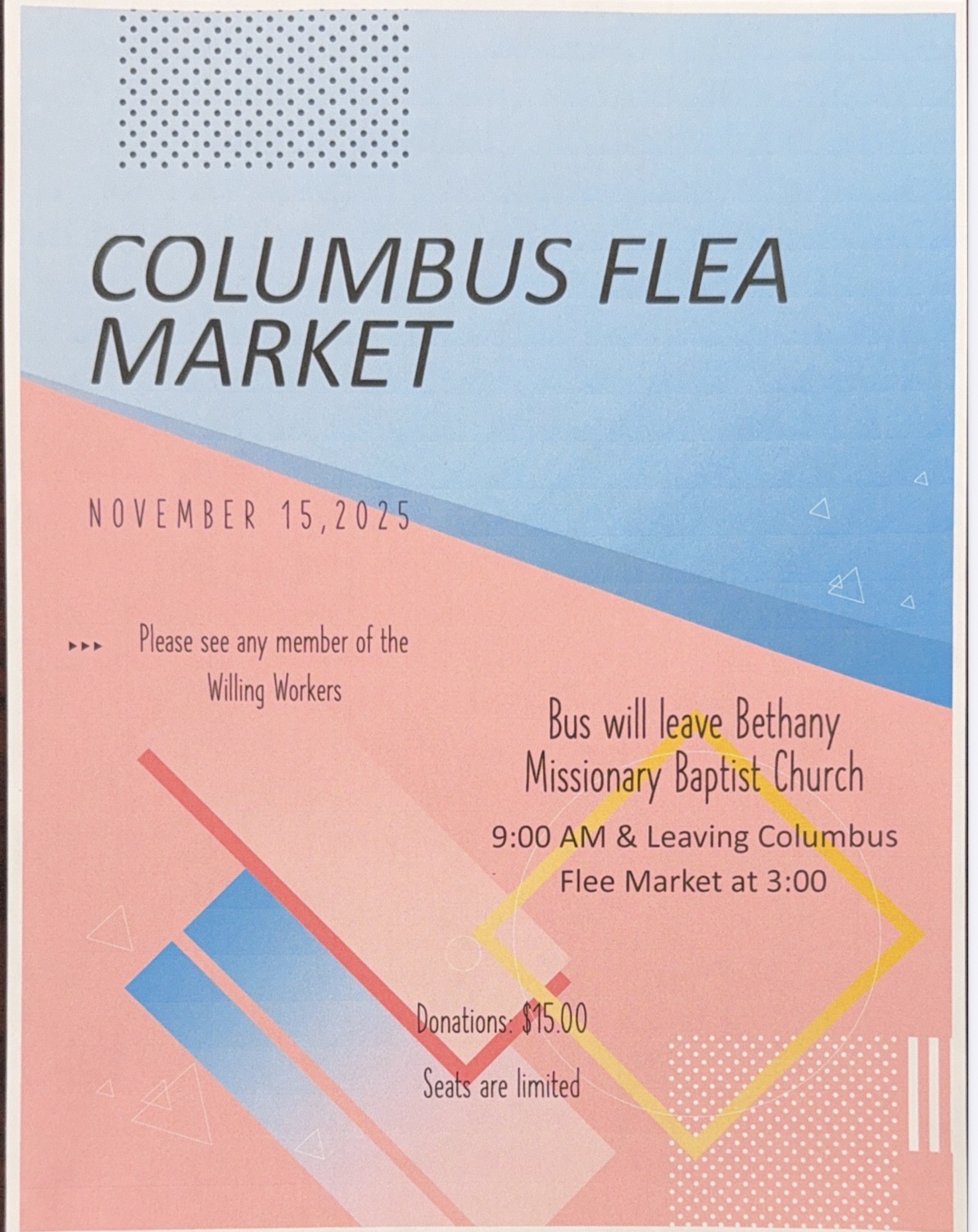 Bus will leave Bethany Missionary Baptist Church at 9 am