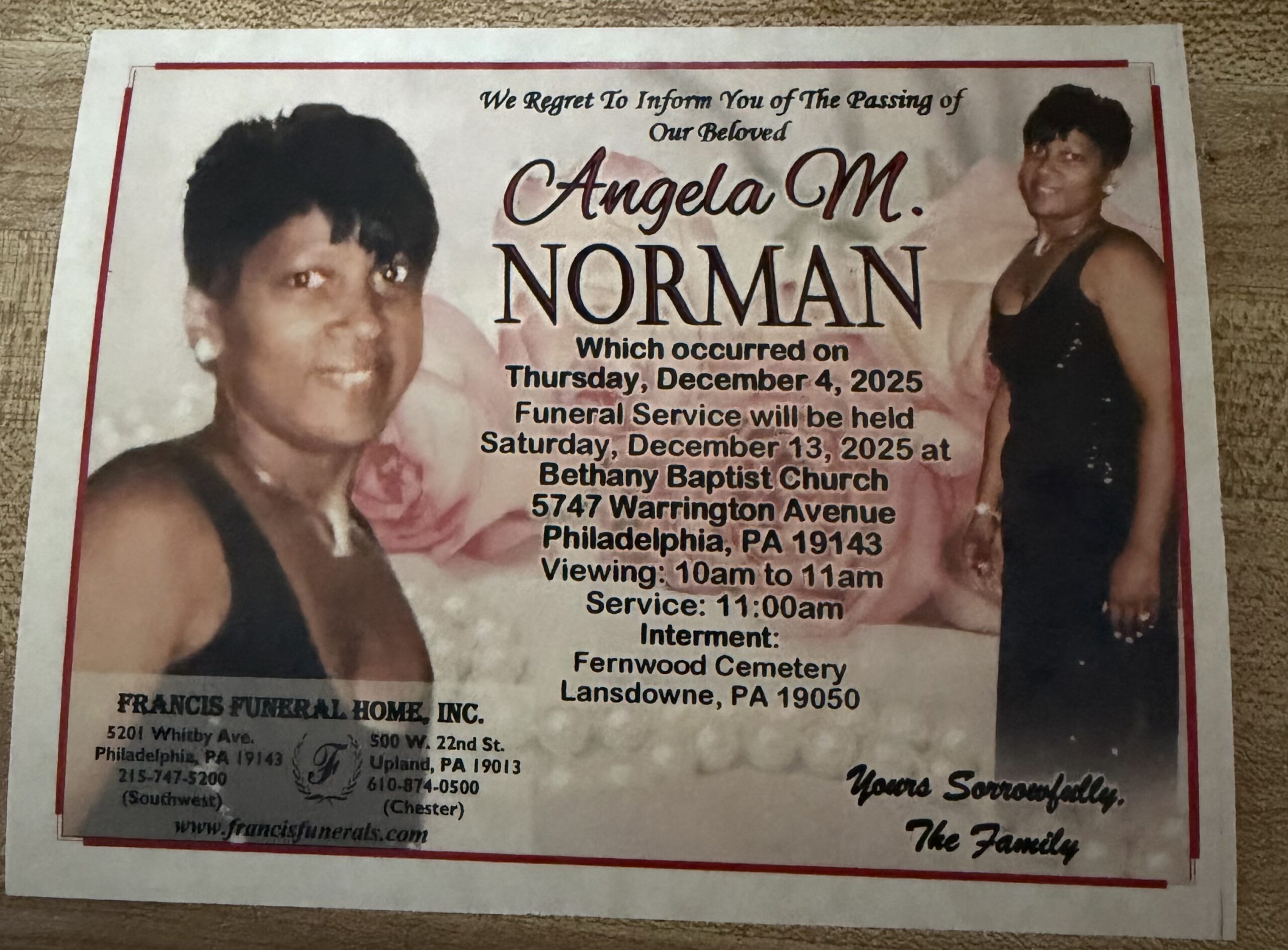 We regret to inform you of the passing of our beloved Angela M. NORMAN Which occurred on Thursday, December 4, 2025 Funeral Service will be held Saturday, December 13, 2025 at Bethany Baptist Church 5749 Warrington Avenue Philadelphia, PA 19143 Viewing: 10am to 11am Service: 11:00am livestream link Interment: Fernwood Cemetery Lansdowne, PA 19050